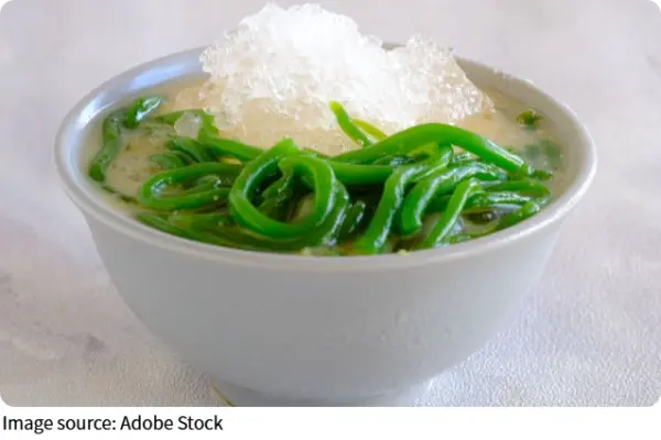 Cendol is another refreshing dessert made from shaved ice, green rice flour jelly, coconut milk, and palm sugar syrup. Different regions offer variations, like Melaka-style Peranakan cendol or Penang’s version.