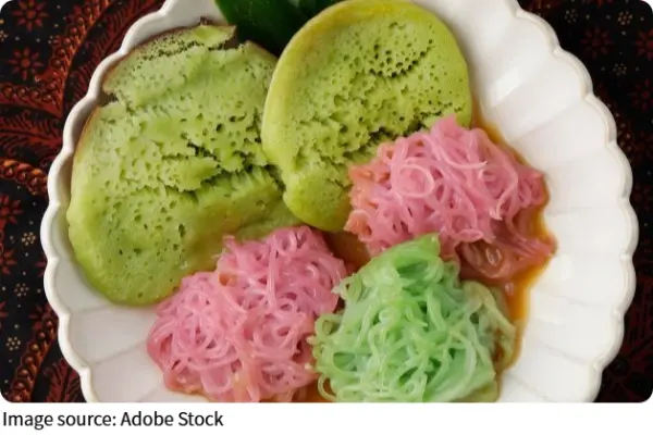 Ondeh-Ondeh, chewy rice balls filled with melted Gula Melaka and rolled in grated coconut, are a favorite among both children and adults. Traditionally green from pandan juice, some versions are now yellow, orange, or purple using sweet potato or yam.
