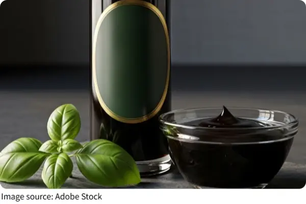 Balsamic vinegar is a dark, glossy condiment with a syrupy texture. Its flavor balances a gentle acidity with subtle sweetness, accompanied by a delicate, slightly vinegary aroma. This harmony of taste and scent makes it instantly recognizable and widely cherished.
